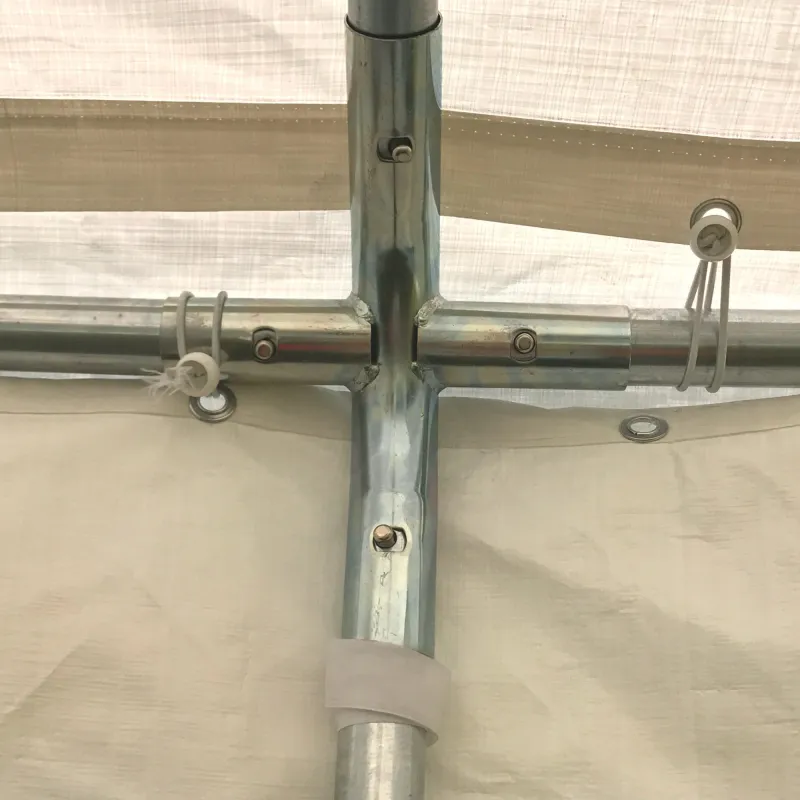 Прочный полиэстер с защитой от UV (180 г/м²) выдерживает дождь, с водонепроницаемостью более 50 кПа. Ткани легко монтируются на металлический каркас палатки. Каркас изготовлен из оцинкованных стальных труб толщиной 38 мм.