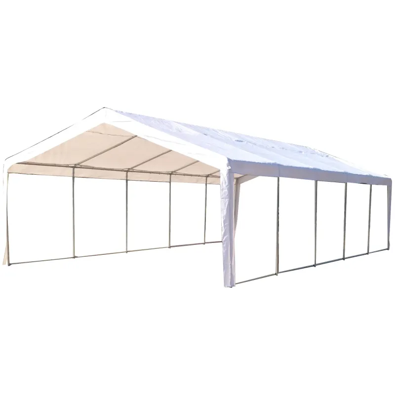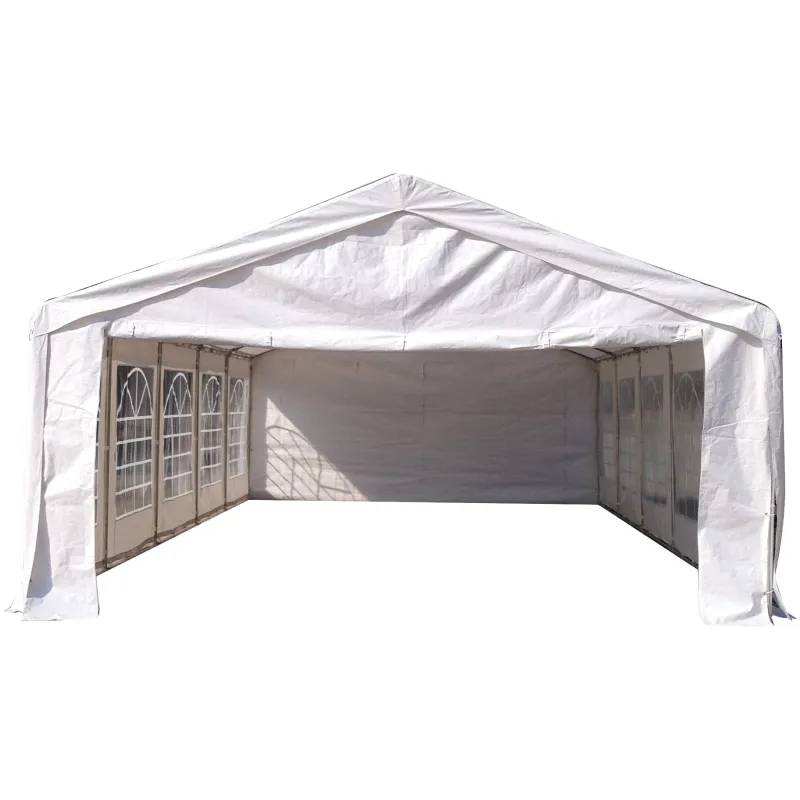 Если на празднике нужно устроить танцы, в этой палатке вряд ли придется даже двигать столы в сторону! Помимо впечатляющей площади, в палатке также много места в высоту (высота в коньке достигает 3 м), поэтому атмосфера в палатке воздушная и просторная. Оба торца оснащены дверями на молнии, которые можно при открытии свернуть вверх. PVC-окна по обеим сторонам обеспечивают хорошее освещение внутри.