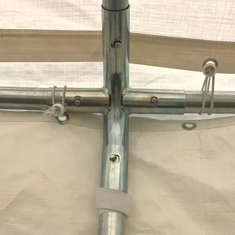 Прочная полиэстеровая ткань с защитой от ультрафиолета (180 г/м²) также устойчива к дождю, ее водонепроницаемость превышает 50 кПа. Ткани легко монтируются на металлический каркас палатки. Каркас изготовлен из 38 мм оцинкованных стальных труб.