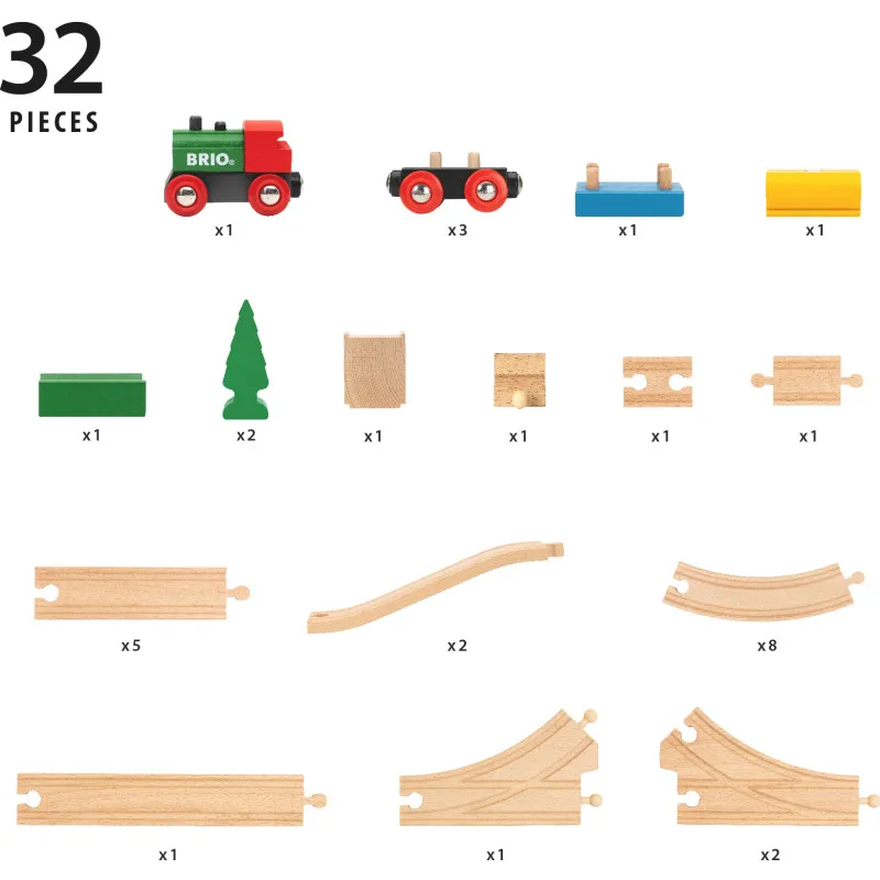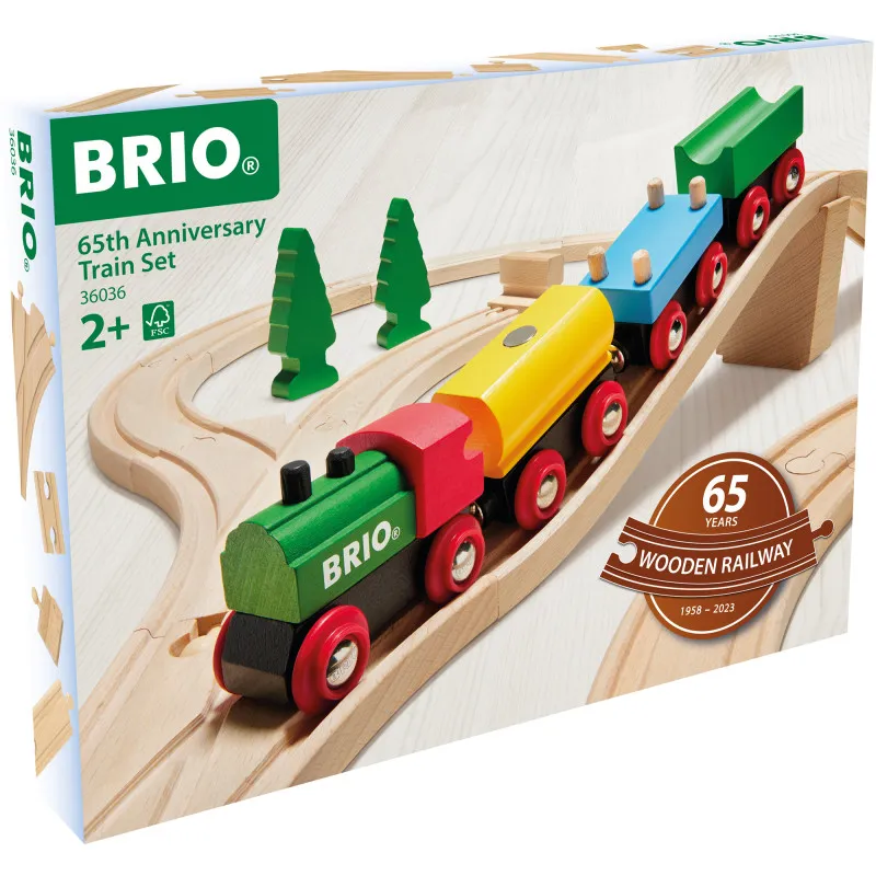 Brio-junasetti 36036 празднует 65-летие поездов Brio. Полностью деревянный набор поездов вдохновлен культовыми игрушками Brio, впервые представленными в 1958 году. В этот 32-компонентный набор входят классический поезд Brio, три красочных вагончика, мост, стрелочные рельсы и два дерева для создания красивого пейзажа. Набор изготовлен из европейского бука.