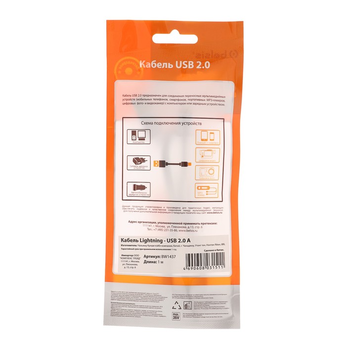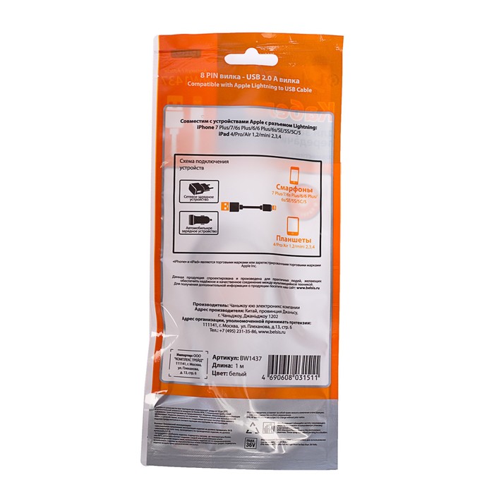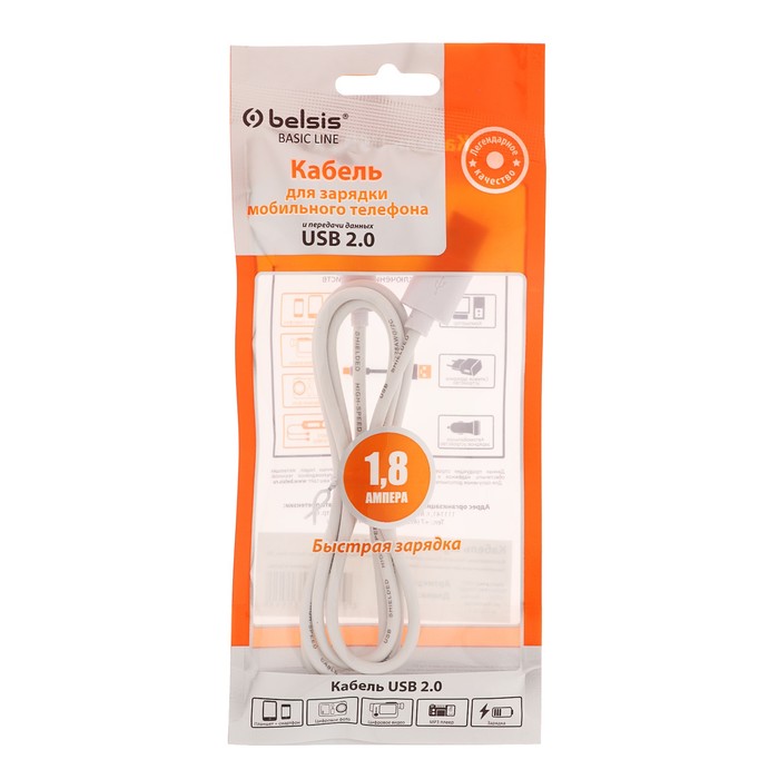 Кабель Belsis, USB - Lighting, 2 А, 1 м, белый — Характеристики