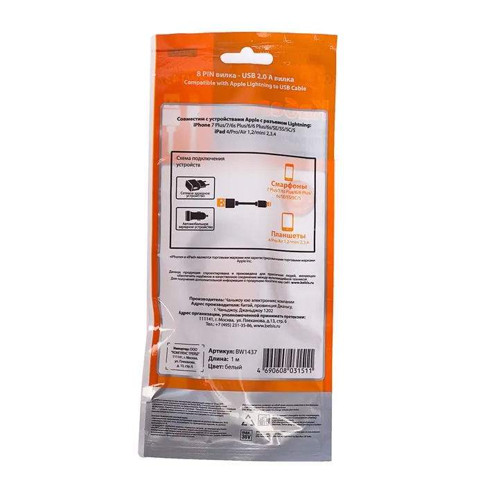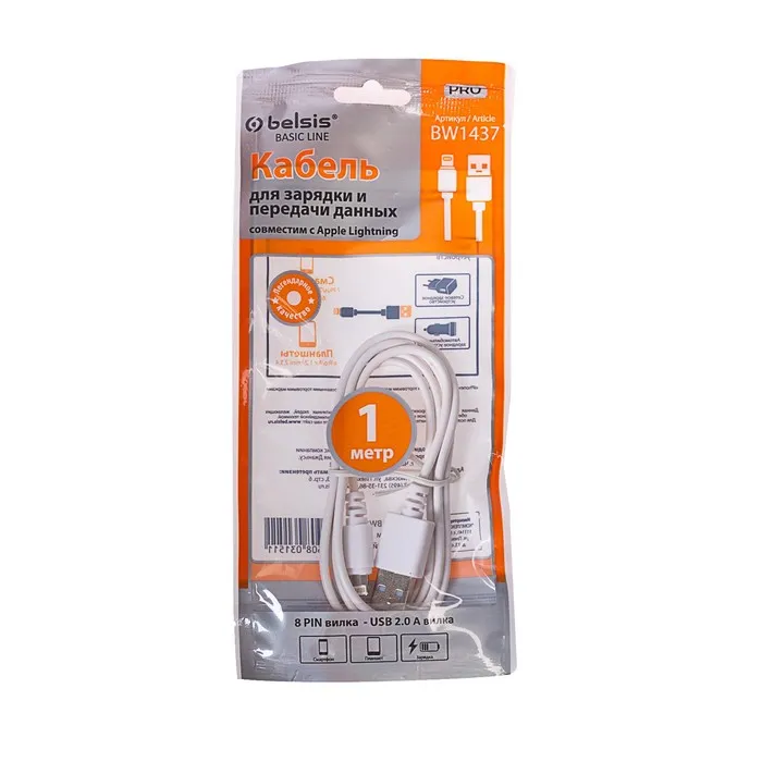 Кабель Belsis, USB - Lighting, 2 А, 1 м, белый — Характеристики
