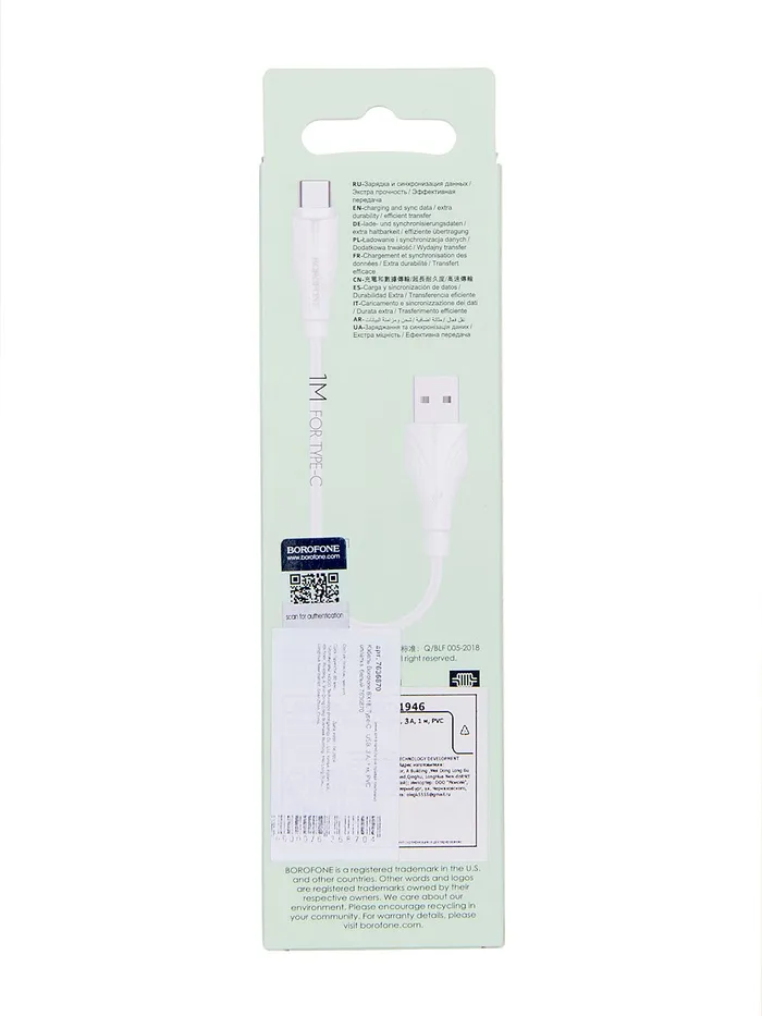 Кабель Borofone BX18, Type-C - USB, 3 А, 1 м, PVC оплётка, белый — Характеристики