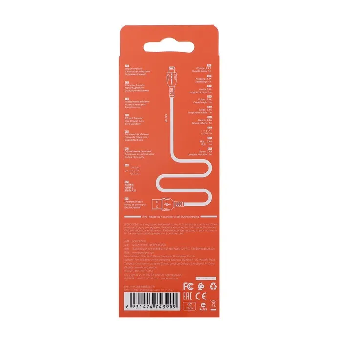 Кабель Borofone BX51, Lightning - USB, 2.4 А, 1 м, PVC оплётка, белый — Характеристики