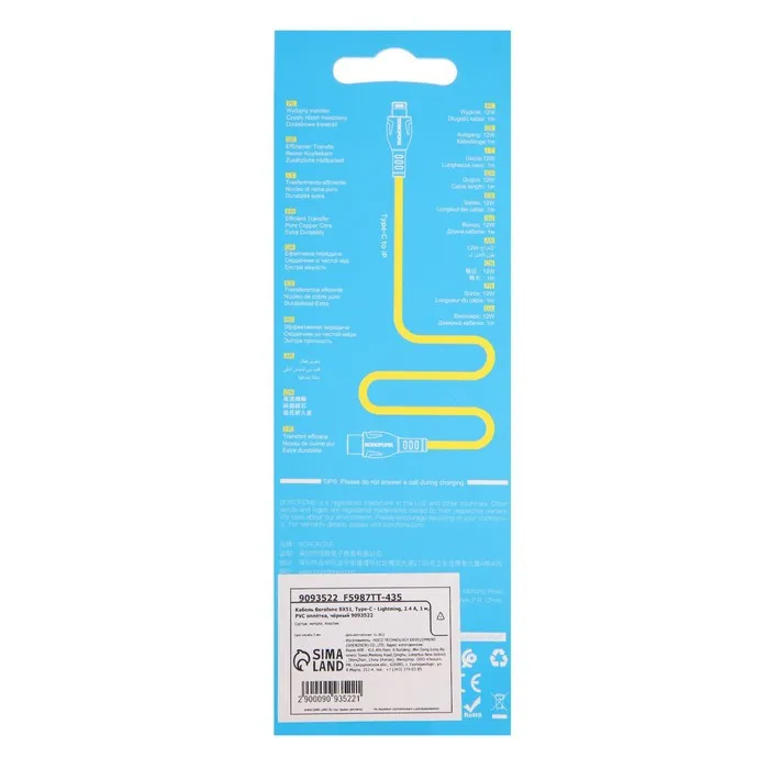 Кабель Borofone BX51, Type-C - Lightning, 2.4 А, 1 м, PVC оплётка, чёрный — Характеристики