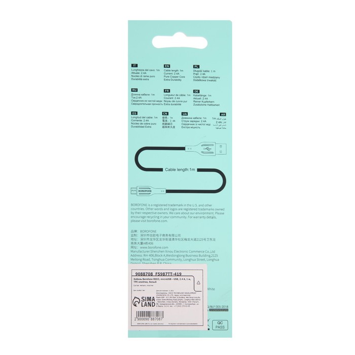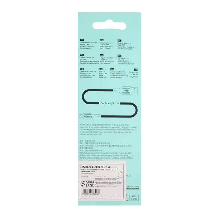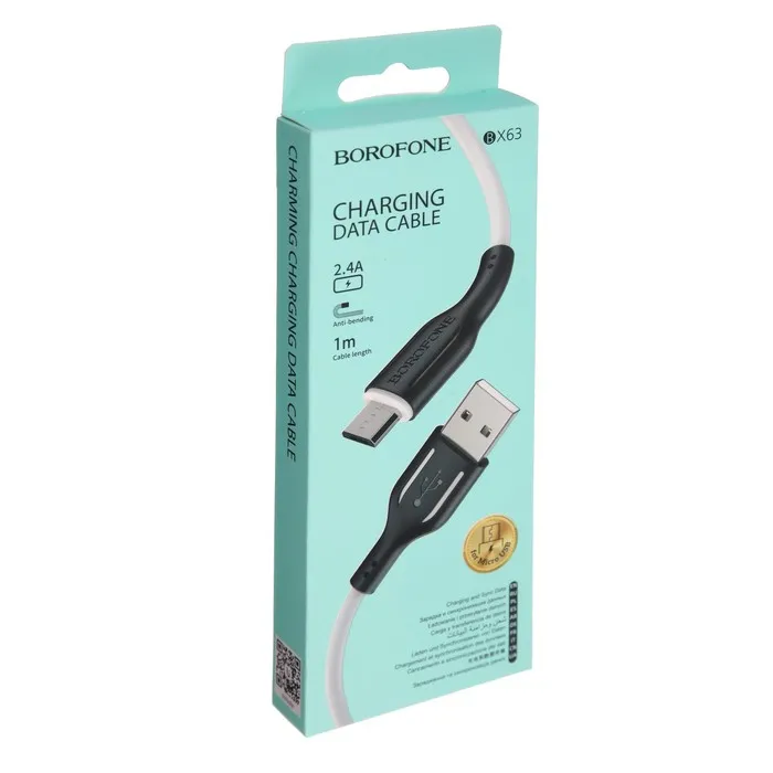 Кабель Borofone BX63, microUSB - USB, 2.4 А, 1 м, TPE оплётка, белый — Характеристики