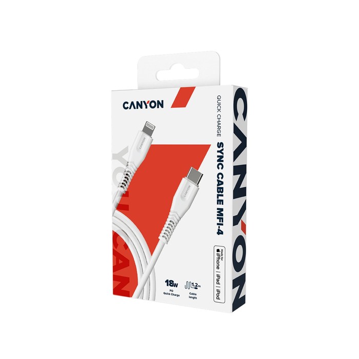 Кабель Canyon MFI-4, Lighting - USB-C, 18 Вт, быстрая зарядка, чип MFI, 1.2 м, белый — Характеристики