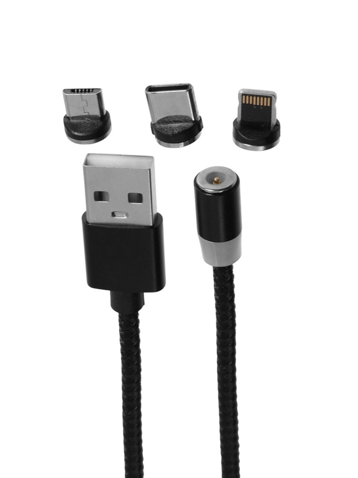 Этот универсальный магнитный кабель длиной 1 м объединяет три типа разъёмов — Type-C, micro USB и Lightning, — что делает его незаменимым помощником для зарядки и передачи данных между устройствами разных брендов. Его чёрный нейлоновый оплеточный корпус выглядит стильно и при этом выдерживает сгибания и частое использование.