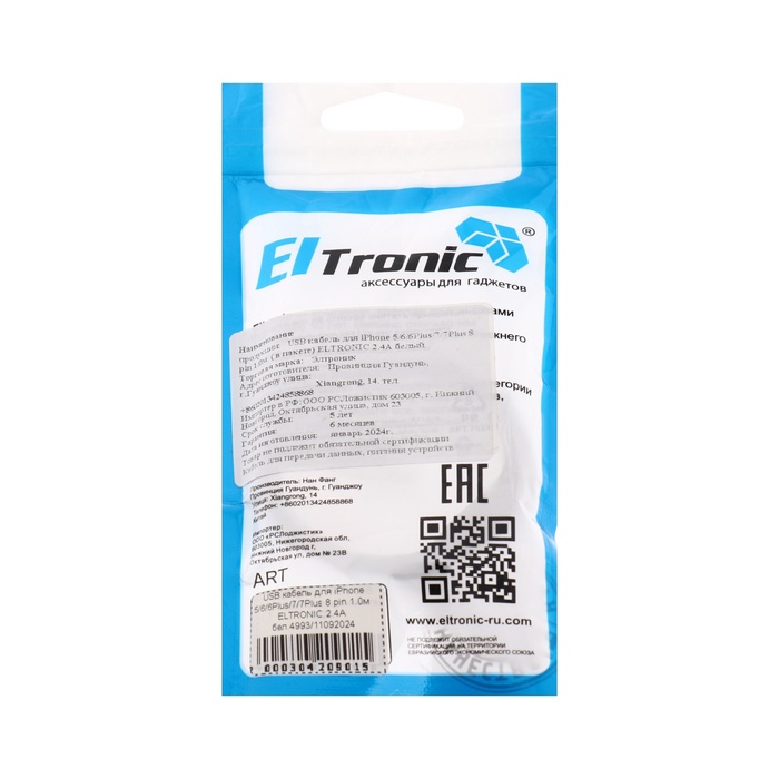 Кабель ELTRONIC, Lightning - USB, 2.4 А, 1 метр, белый — Характеристики