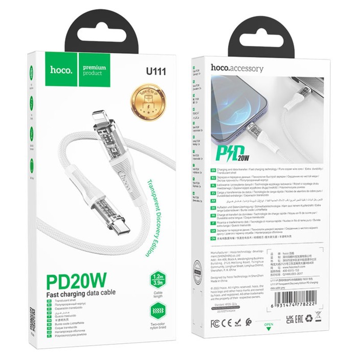 Кабель Hoco U111, Type-C - Lightning, 1.2 м, прозрачный, зарядка, передача данных, серый — Характеристики