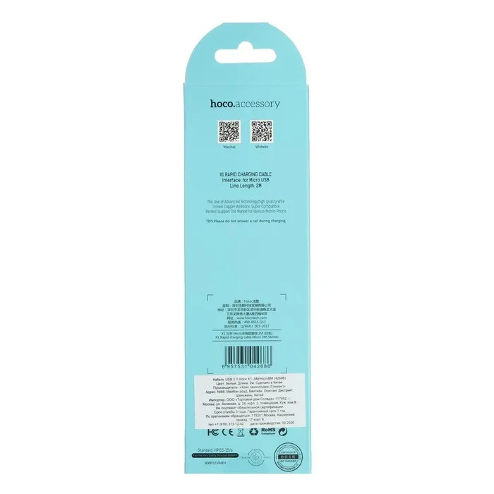 Кабель Hoco X1 microUSB - USB, 2 м, белый — надежный и функциональный аксессуар для зарядки и синхронизации устройств. С поддержкой тока до 2.4 А кабель обеспечивает быструю зарядку смартфонов, планшетов, портативных аккумуляторов и других гаджетов с разъемом microUSB.