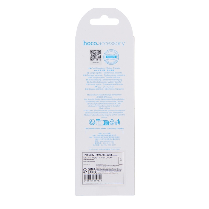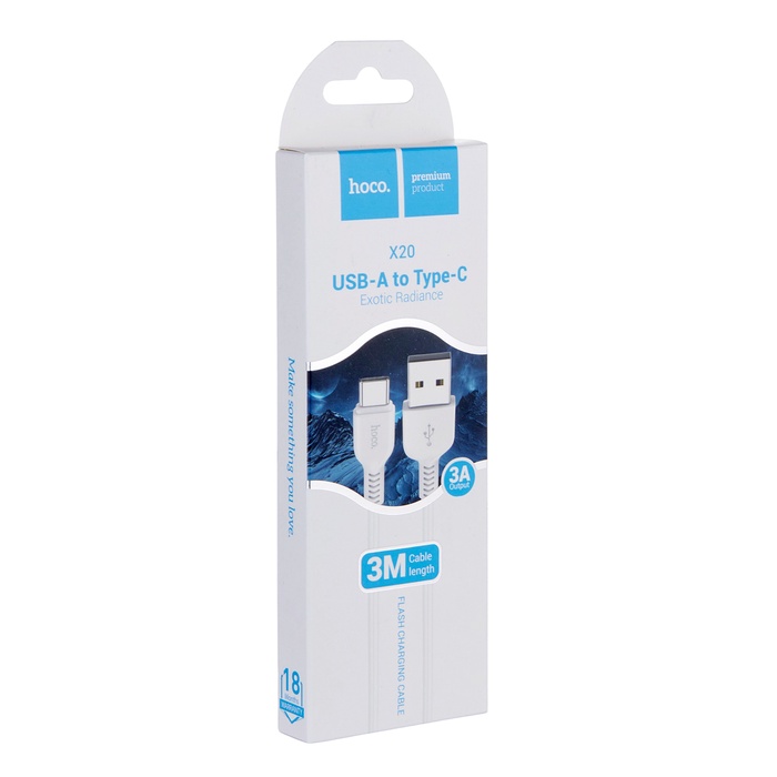 Кабель Hoco X20, Type-C - USB, 3 А, 3 м, PVC оплетка, белый — Характеристики