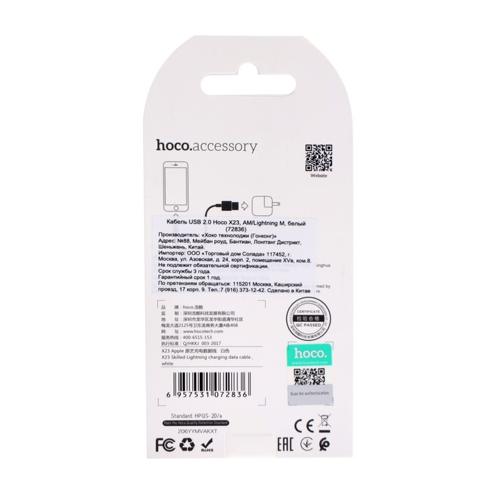 Кабель Hoco X23, Lightning - USB, 2 А, 1 м, TPE оплетка, белый — Характеристики