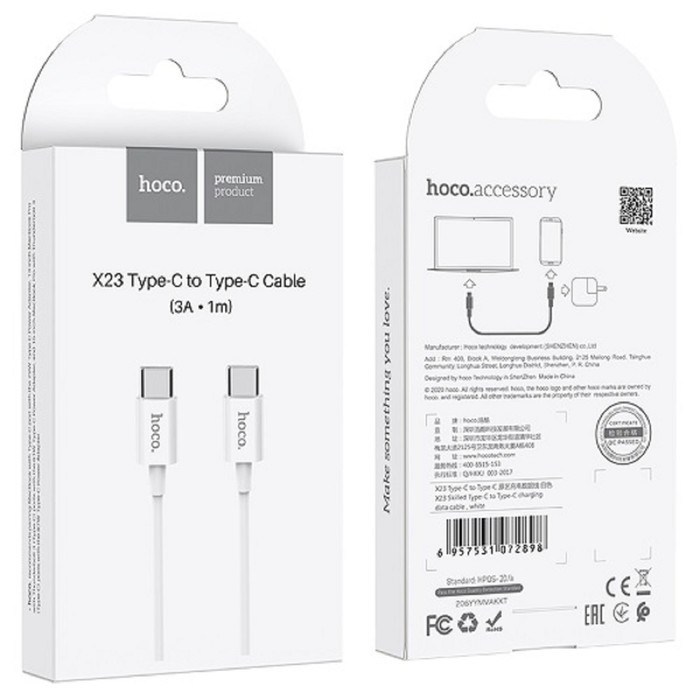 Кабель Hoco X23, Type-C - Type-C, 3 А, 1 м, TPE оплетка, белый — Характеристики