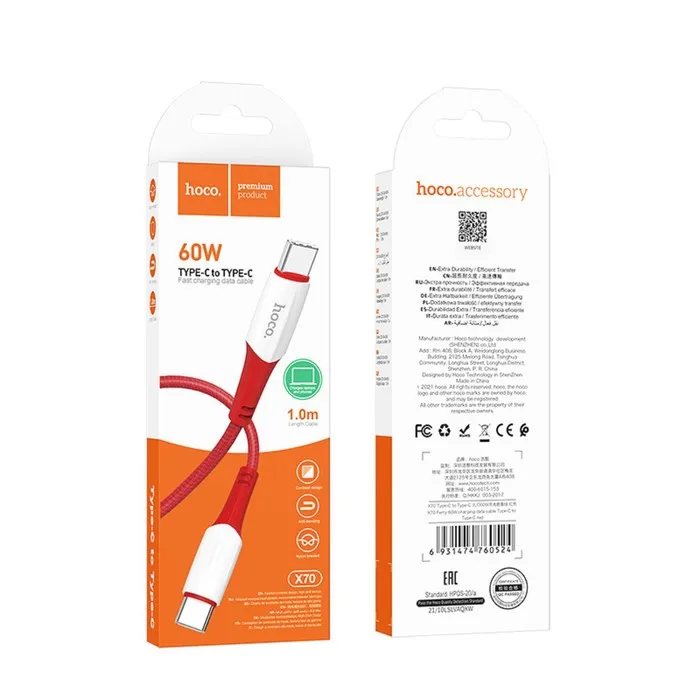 Hoco X70 — мощный кабель с разъёмами Type-C - Type-C, разработанный для быстрой зарядки и передачи данных. Поддержка мощности до 60 Вт позволяет заряжать ноутбуки, смартфоны и планшеты с высокой скоростью, а сила тока 3 А обеспечивает стабильность и безопасность. Прочная нейлоновая оплётка защищает кабель от износа, делая его идеальным выбором для активного использования. Яркий красный цвет добавляет стилю вашему устройству, выделяя его среди других аксессуаров.