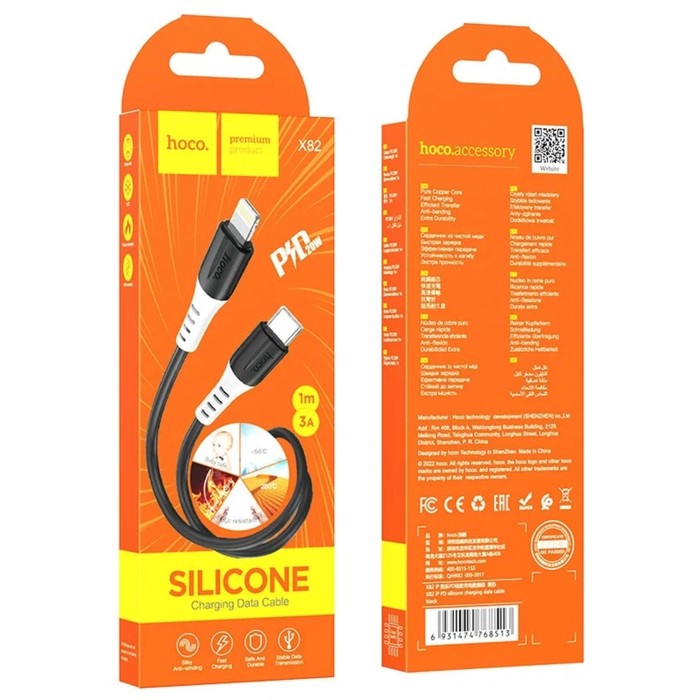 Кабель Hoco X82, Type-C - Lightning, 3 А, 1 м, оплётка силикон, чёрный — Характеристики