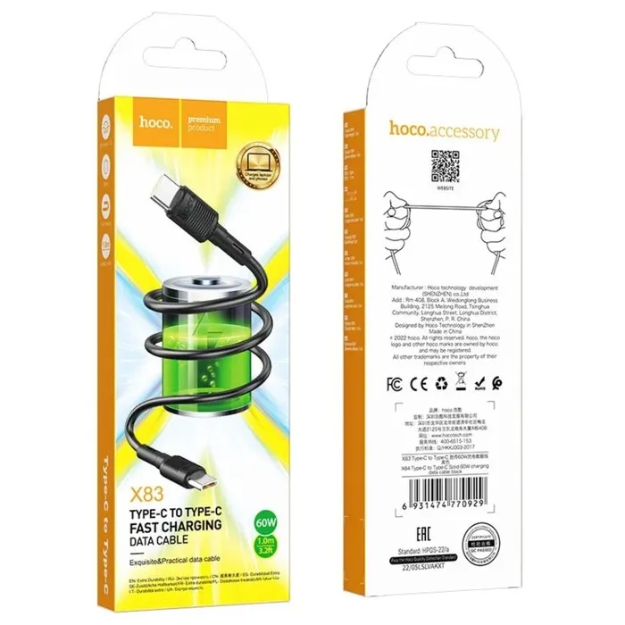 Кабель Hoco X83, Type-C - Type-C, 60 Вт, 3 А, 1 м, передача данных, ПВХ, чёрный — Характеристики
