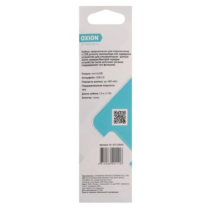 Кабель OXION DCC258, microUSB - USB, зарядка + передача данных, 1.3 м, оплетка, белый — Характеристики