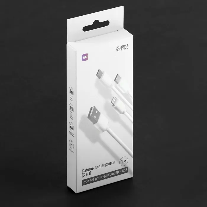 Кабель Windigo, 3 в 1, microUSB/Lightning/Type-C - USB, 2 А, PVC оплетка, 1 м, белый — Характеристики