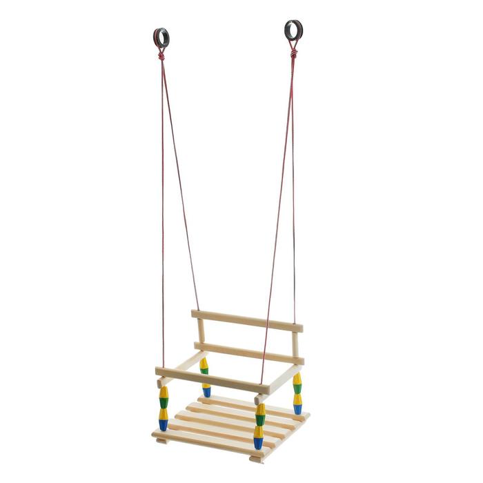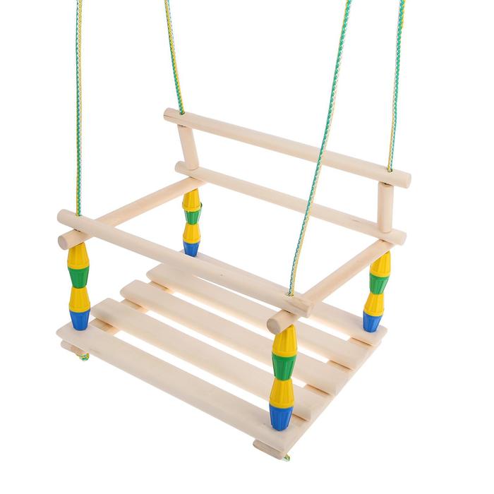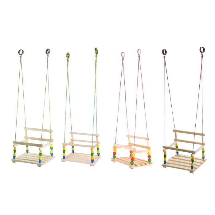Сиденье выполнено из дерева, которое обладает достаточно плотной структурой. Поэтому такие качели безопасны для здоровья малышей.
