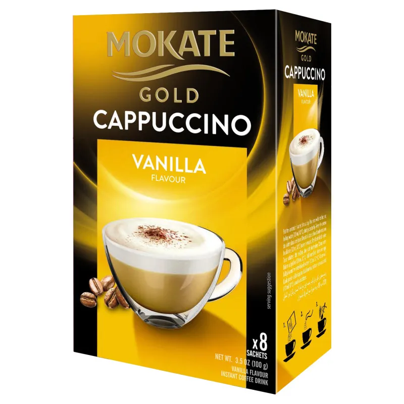 Cappuccino Gold Vanilla – насладитесь вкусом ванильного капучино, не выходя из дома или где бы вы ни были. Капучино Gold изготовлено из высококачественных, нежно обжаренных кофейных зерен, которые раскрывают лучшие вкусы кофе. Вспененное молоко и щепотка сахара завершают кофейное удовольствие. Капучино Gold – это быстрорастворимый кофе, который легко приготовить: просто добавьте 120 мл горячей воды, перемешайте и наслаждайтесь! В упаковке 8 порционных пакетиков, общим весом 100 г. Мы постоянно обновляем информацию о продукте. Однако, рекомендуется всегда проверять информацию на упаковке.