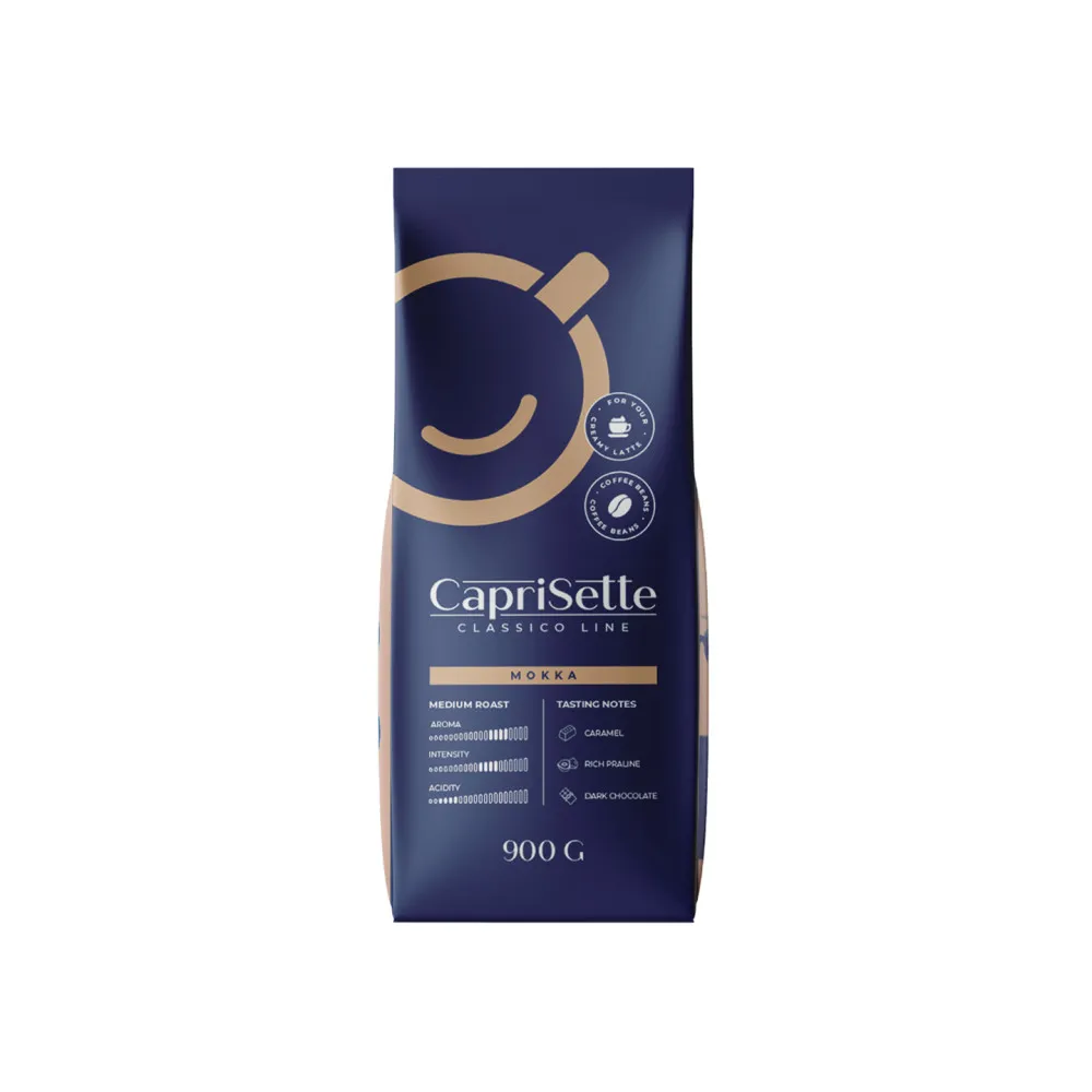«Caprisette Classico Mokka» особенно подойдет любителям насыщенных латте. Эта смесь средней обжарки состоит из бразильских, гондурасских, индийских и угандийских кофейных зерен и содержит 80% арабики и 20% робусты. Наслаждайтесь насыщенными нотками сладкой карамели, орехового пралине и темного шоколада – и идеальным расслабляющим кофейным моментом.