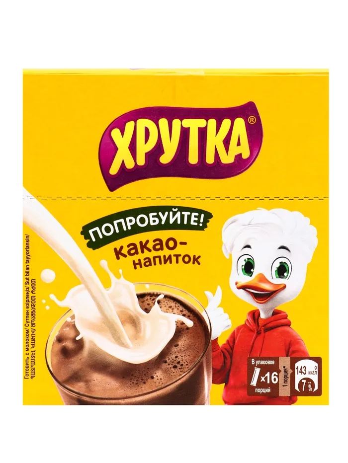 Какао-напиток "Хрутка" - это напиток с нежным шоколадным вкусом, благодаря которому Вы зарядитесь отличным настроением на весь день! Просто добавьте 2 чайные ложки какао в стакан молока - и ароматный напиток для завтрака готов! В молоке содержится кальций, необходимый для крепких и здоровых костей, а какао-порошок от природы является источником магния, железа и фосфора. С нежным шоколадным вкусом какао-напитка "Хрутка" пить молоко намного вкуснее.