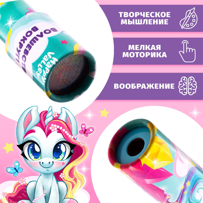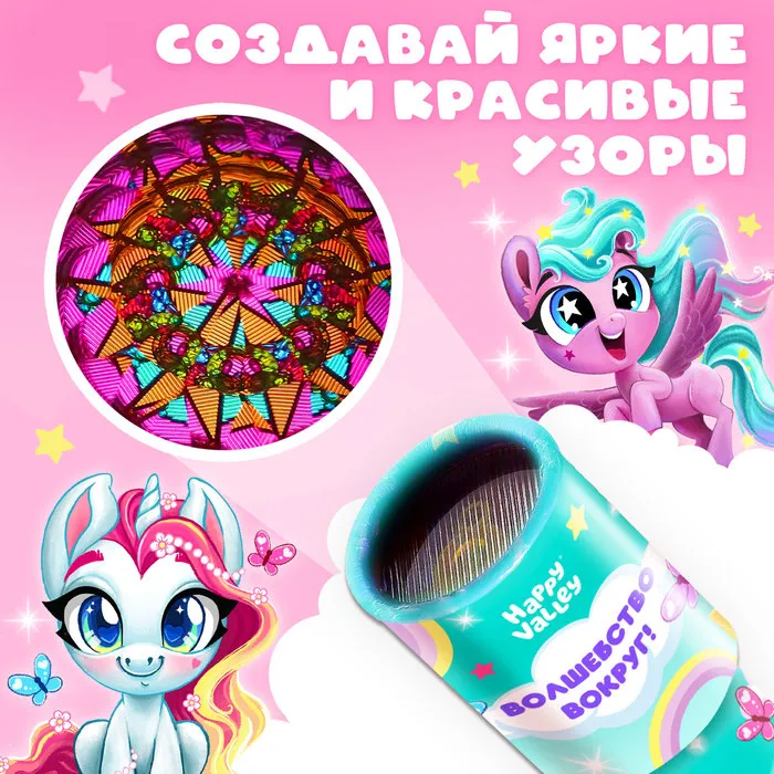 Создавай волшебные узоры вместе с пони! Калейдоскоп «Волшебство вокруг» — это яркая игрушка для детей от 3 лет. Вращайте трубку — и перед глазами будут появляться красочные узоры. Простое управление и яркие образы увлекут ребёнка надолго.