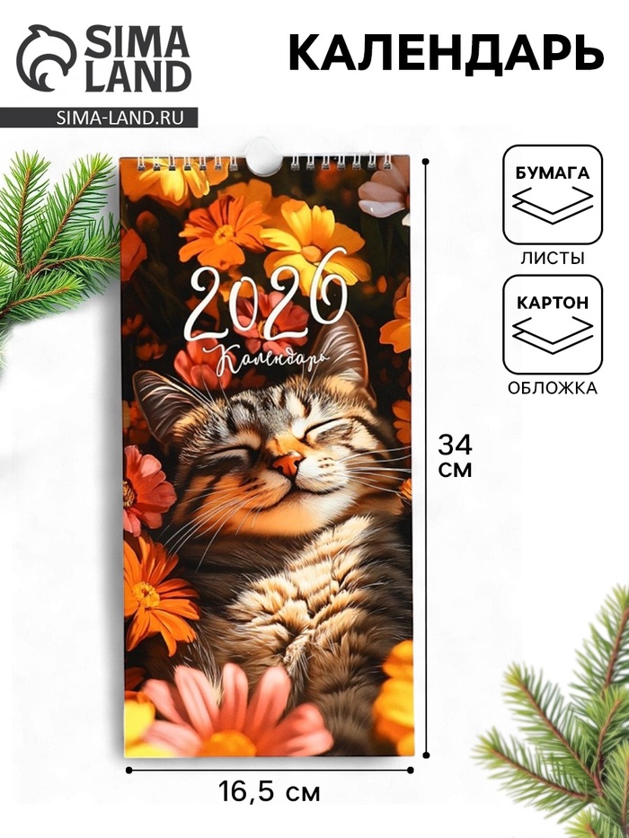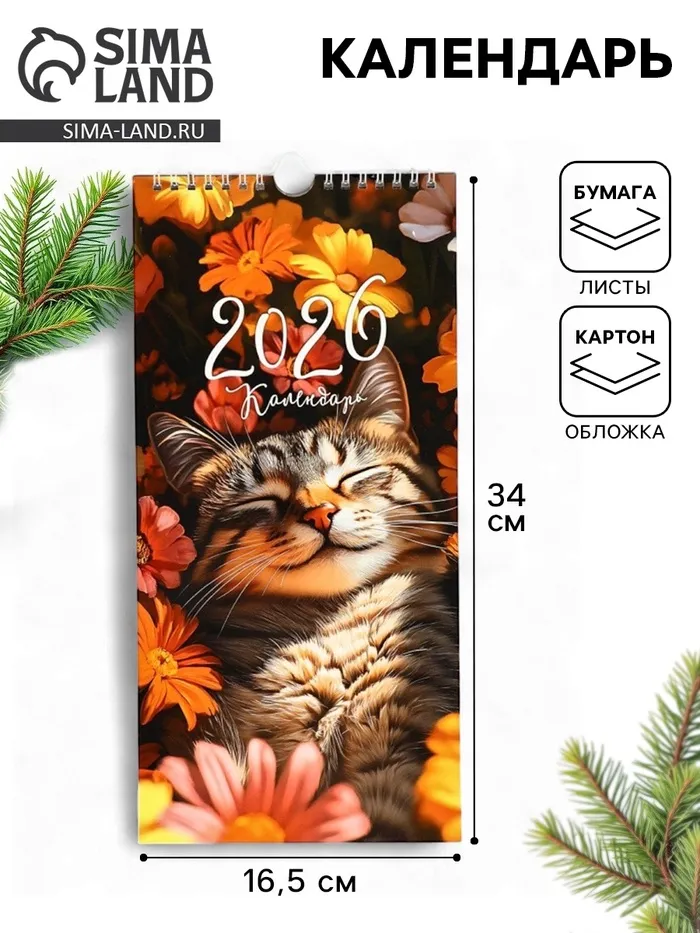 Календарь 2026 на ригеле «Кот в цветах» 16.5×34 см — Характеристики