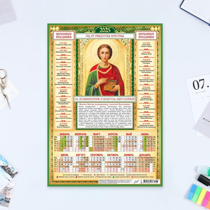 Календарь листовой А3 «Пантелеймон Целитель» 2025 год, 30×42 см