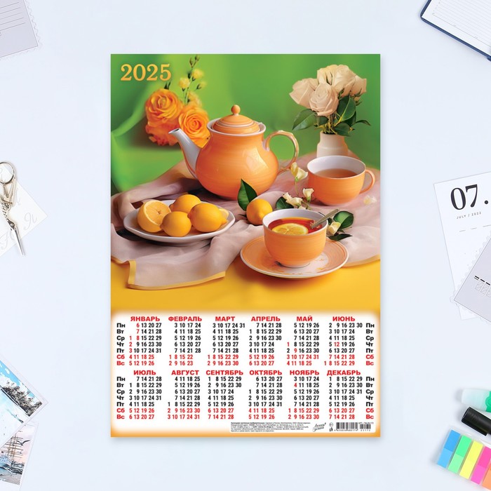 Календарь листовой А3 «Натюрморт: чай с лимоном» 2025 год, 30×42 см