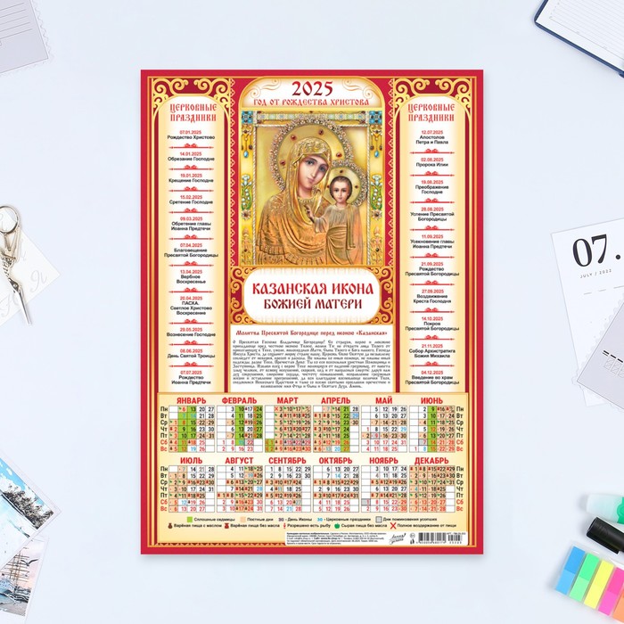Календарь листовой А3 «Казанская Икона Божией Матери» на красном, 2025 год, 30×42 см — Характеристики