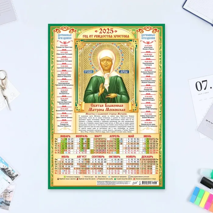 Календарь листовой А3 «Матрона Московская» на зеленом, 2025 год, 30×42 см