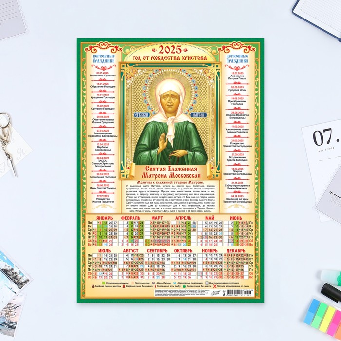 Календарь листовой А3 «Матрона Московская» на зеленом, 2025 год, 30×42 см — Характеристики