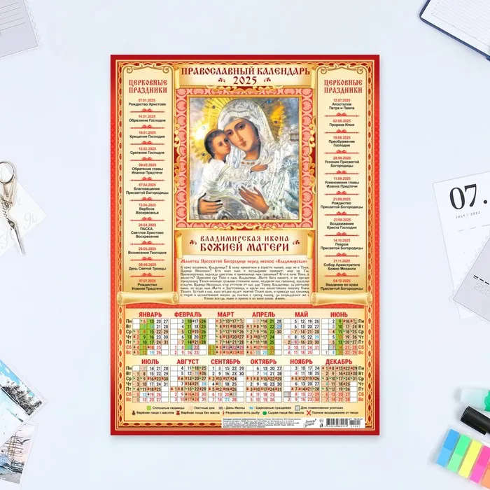 Календарь листовой А3 «Владимирская Икона Божией Матери» на красном, 2025 год, 30×42 см — Характеристики