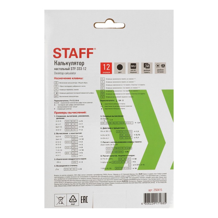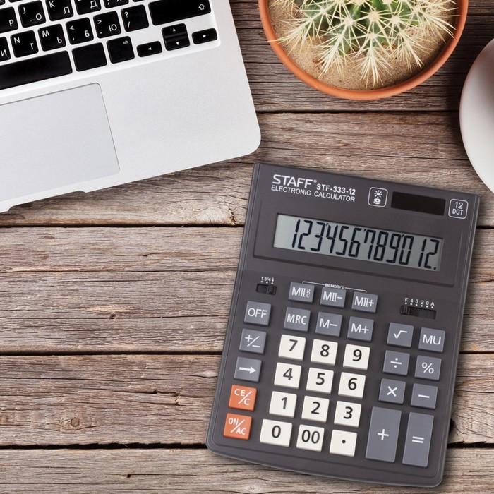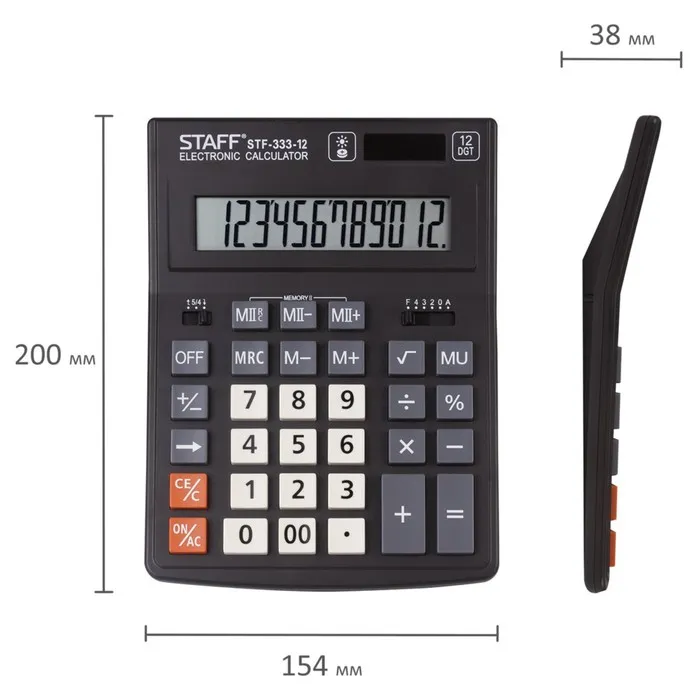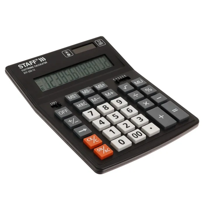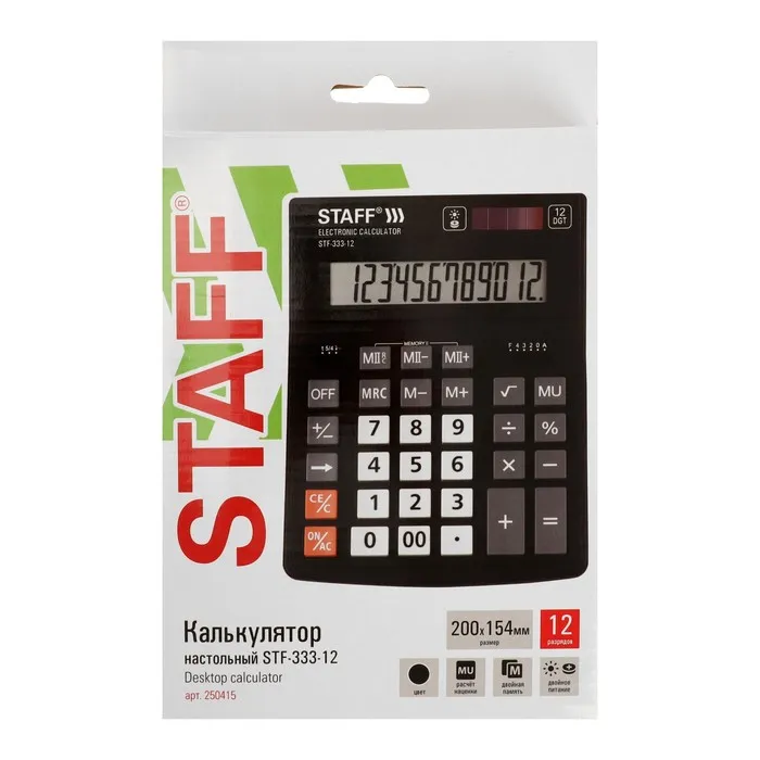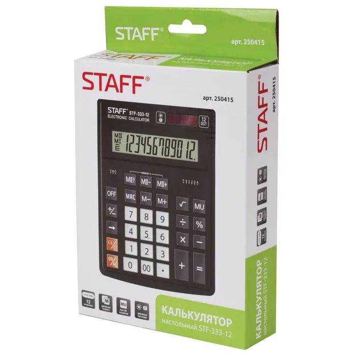 Настольный калькулятор STAFF PLUS STF-333 популярен как среди бухгалтеров, так и среди продавцов, банковских и офисных сотрудников. Имеет две независимые памяти, возможность установки режимов округления и ограничения количества знаков после запятой, клавишу корректировки введенного последнего знака, клавишу "Два нуля". Разрядность дисплея - 12 выводимых на табло цифр, позволяет работать с крупными числами. Клавиша вычислениея MU предназначена для финансовых расчетов с учетом торговой наценки. Для экономии энергии предусмотрены два источника питания: солнечная и алкалиновая батареи. Благодаря крупному дисплею и клавишам настольный калькулятор легок в использовании. Черно-серый цвет модели отлично впишется в офисный и домашний интерьер.