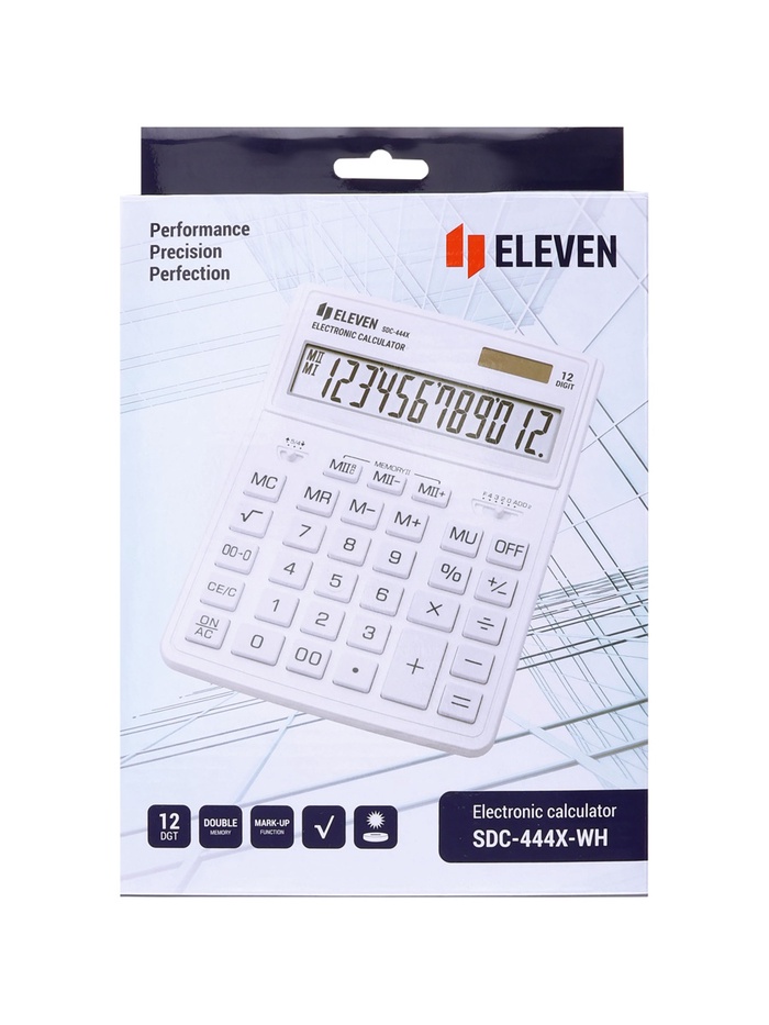 12-ти разрядный настольный калькулятор Eleven SDC-444X-WH предназначен для выполнения арифметических операций. Оптимальный набор функций поможет автоматизировать расчёты: вычисление квадратного корня, коррекция последнего введенного значения, кнопка «00», двойная память, расчёт наценки, смена знака. Двойное питание (солнечная батарея + батарея GP189(LR54)) и автоматическое отключение увеличивают срок службы. Размер калькулятора – 153х199х31 мм, вес – 209 г, цвет – чёрный. Упакован в картонную коробку. Гарантия 5 лет