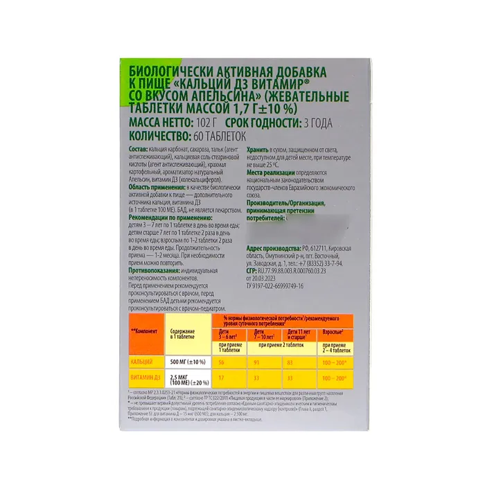 БАД. Дополнительный источник кальция, витамина Д3 таб. (кальция карбонат – 1,25 г (эквивалентно элементарному кальцию 500 мг), Витамин Д3 (холекальциферол) – 2,5 мкг (100 МЕ).