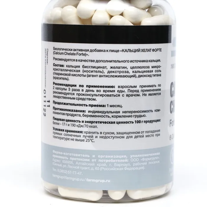 Состав: Кальция бисглицинат, желатин, целлюлоза микрокристаллическая (носитель), декстроза, кальциевая соль стеариновой кислоты (агент антислеживающий), диоксид титана (краситель).