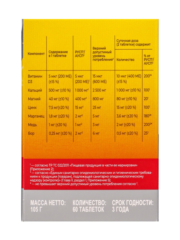 Кальций карбонат, магний, цинк, витамин D3, вспомогательные вещества.