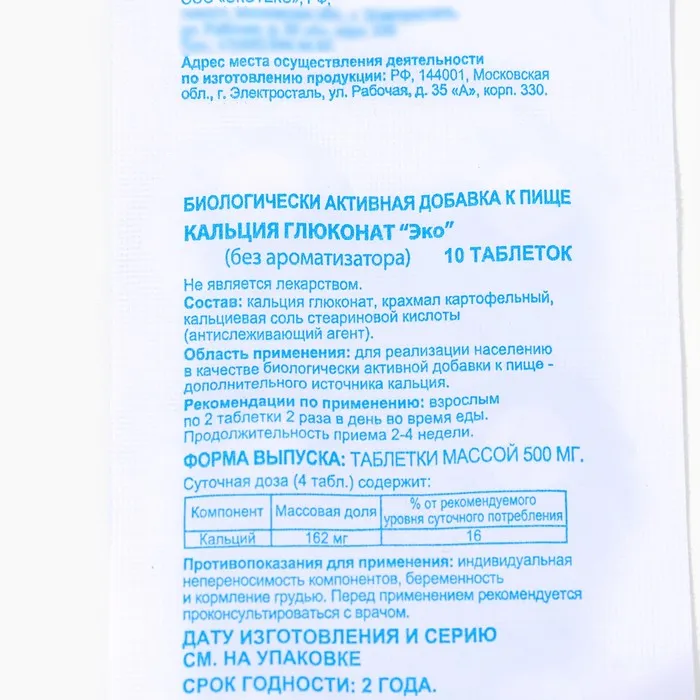 Кальция глюконат, кальция стеарат, крахмал картофельный.