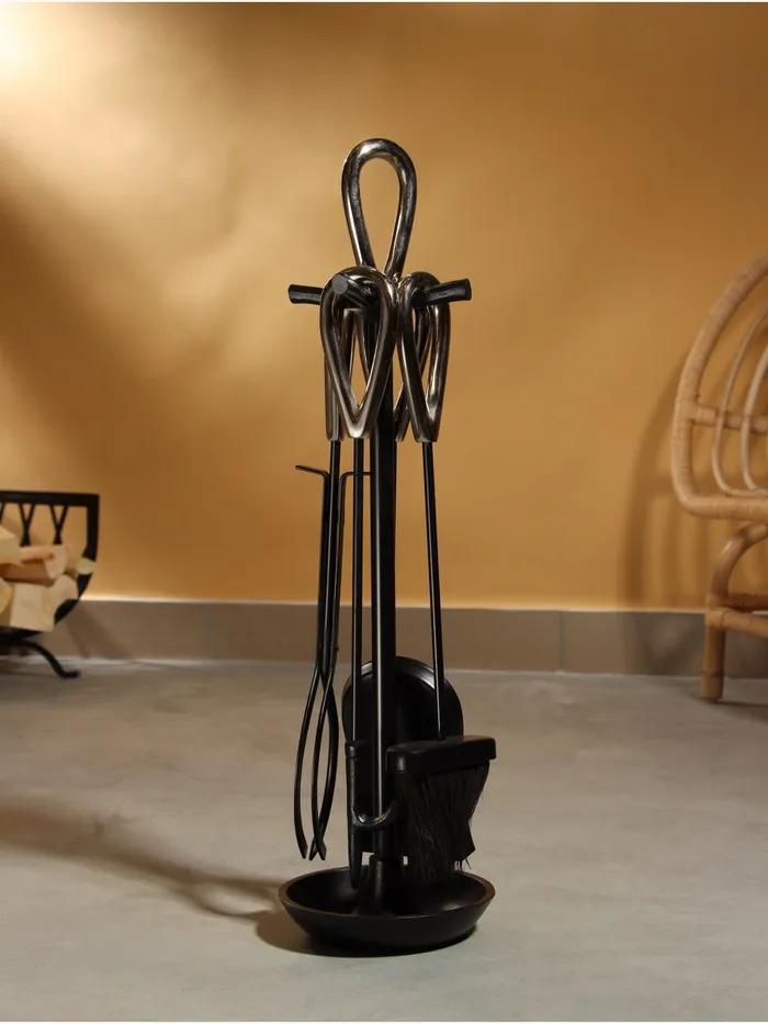 Каминный набор КН-6-4 кованый с дровницей, цвет бронза, 3 предмета: кочерга, совок, метёлка