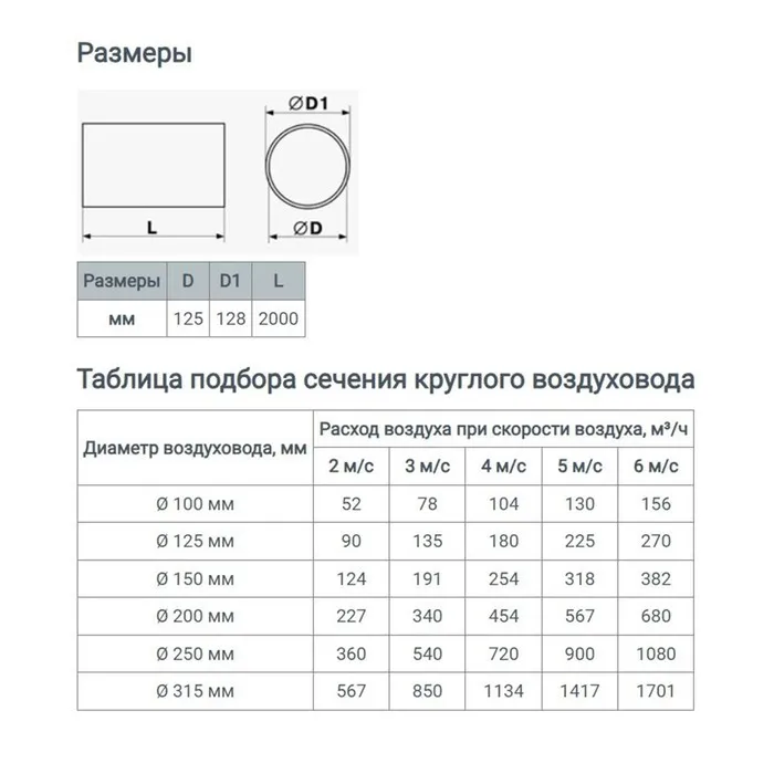 Канал круглый, вентиляционный ZEIN, d=125 мм, 2.0 м — Характеристики