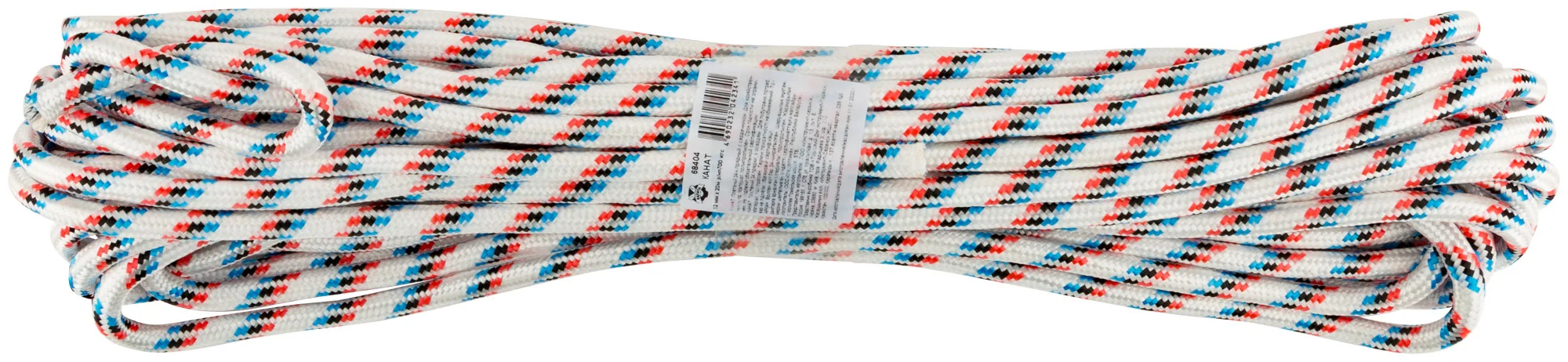 Канат выполнен из полипропилена, что обеспечивает высокую износостойкость и устойчивость к воздействию влаги. Плетение из 24 прядей с сердечником добавляет дополнительную прочность и надежность конструкции.