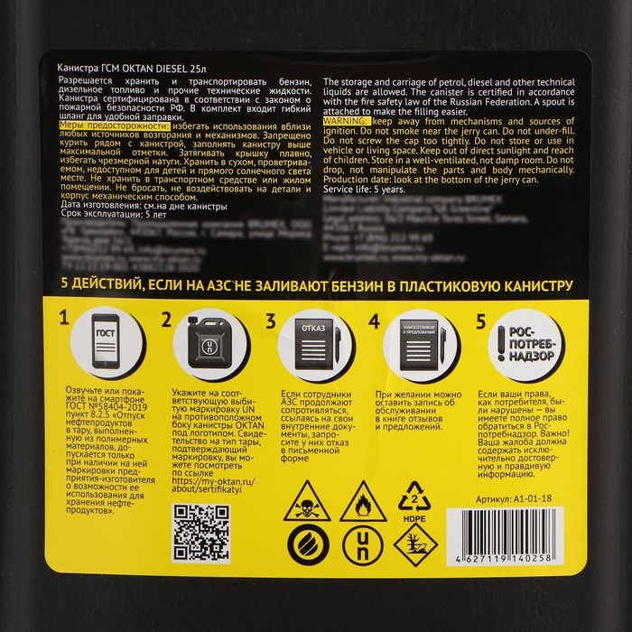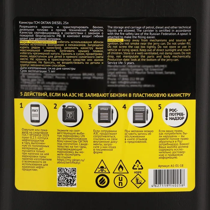 Канистра ГСМ Oktan DIESEL, 25 л, пластиковая, черная — Характеристики
