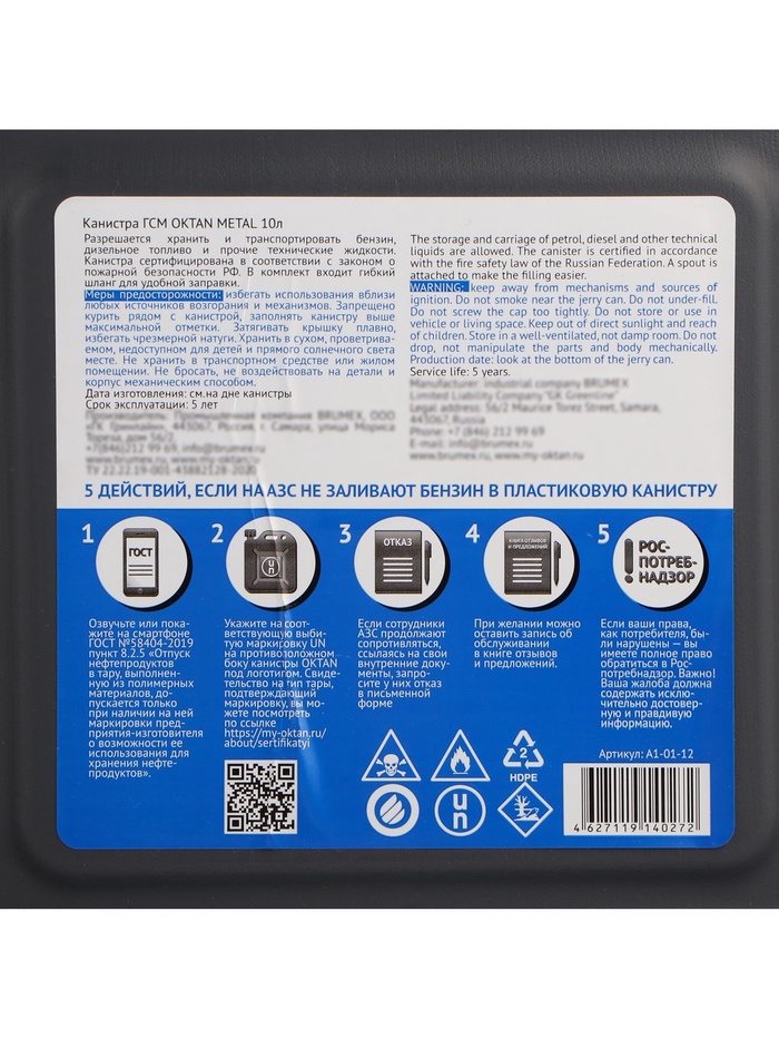 Канистра ГСМ Oktan METAL предназначена для хранения и перевозки топлива (дизель, бензин и прочие технические жидкости).