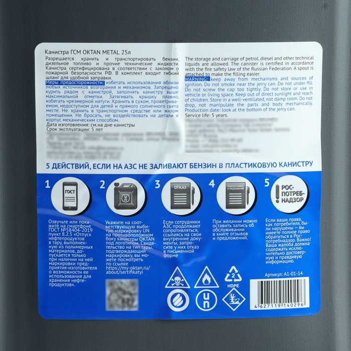 Канистра ГСМ Oktan METAL предназначена для хранения и перевозки топлива (дизель, бензин и прочие технические жидкости).