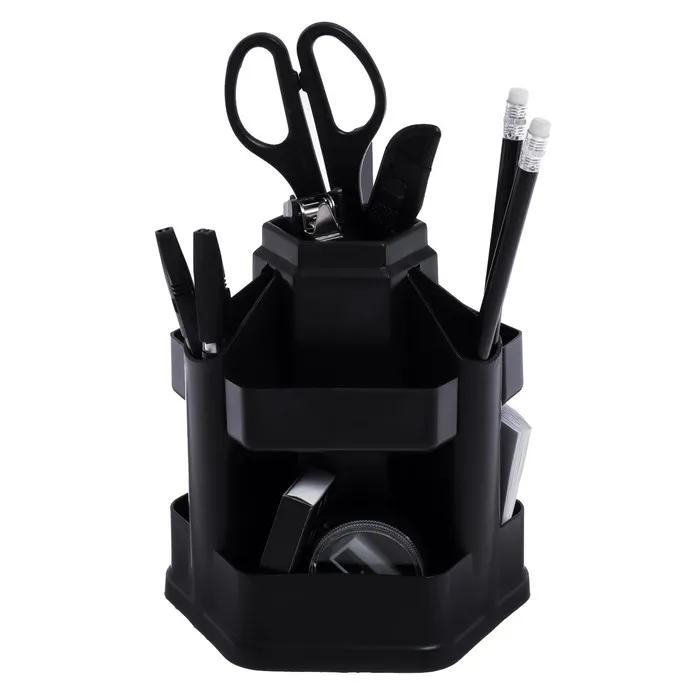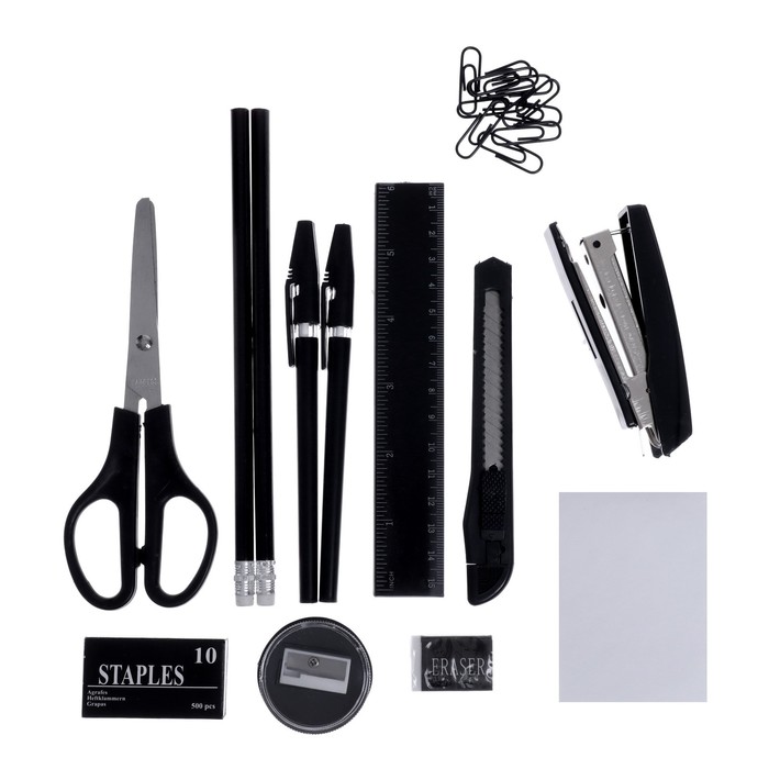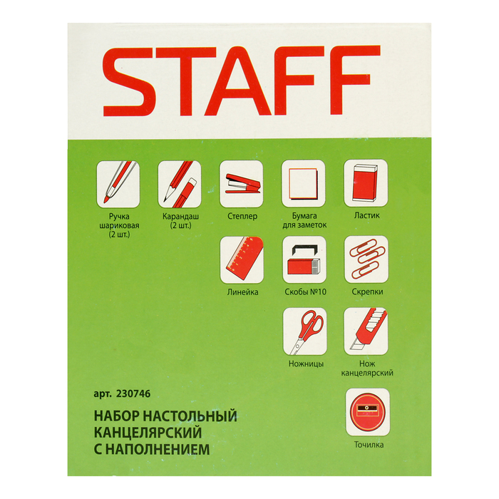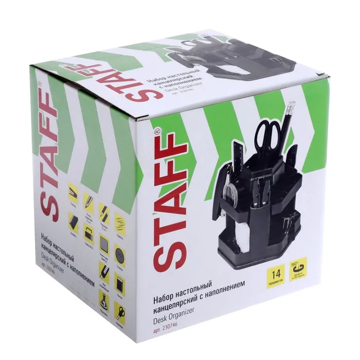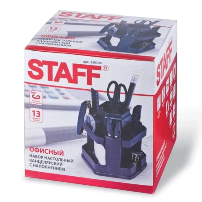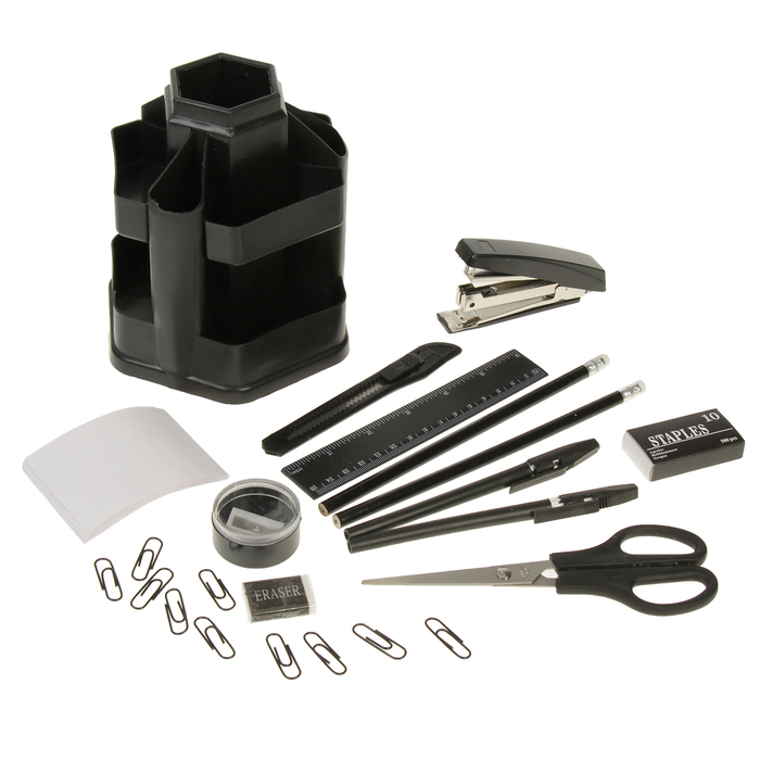 Настольный набор STAFF "Офисный" позволяет эффективно и эргономично организовать рабочее место. Подставка изготовлена из пластика и имеет 10 отделений.В наборе 14 предметов:- подставка,- ножницы,- канцелярский нож,- 2 шариковых ручки,- степлер №10,- скобы для степлера №10,- стирательная резинка,- линейка,- скрепки канцелярские,- 2 чернографитных карандаша,- бумага для заметок,- точилка.