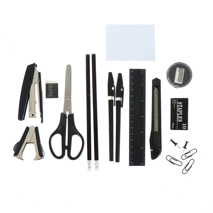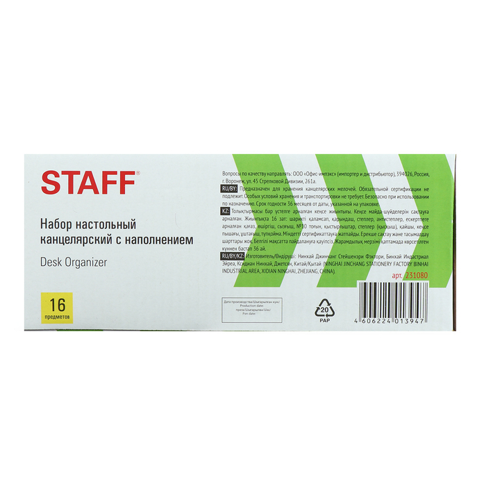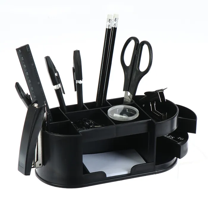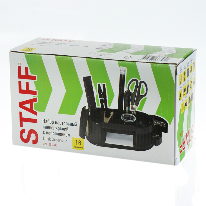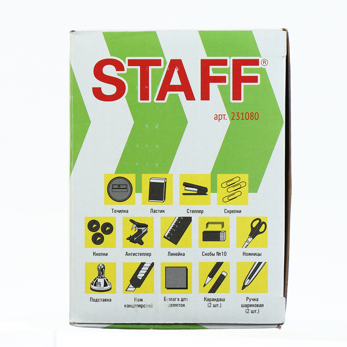 Настольный набор STAFF "Омега" позволяет эффективно и эргономично организовать рабочее место. Подставка изготовлена из пластика и имеет 11 отделений.В наборе 16 предметов:- подставка,- ножницы,- канцелярский нож,- 2 шариковых ручки,- степлер №10,- скобы для степлера №10,- антистеплер,- стирательная резинка,- линейка,- скрепки канцелярские,- 2 чернографитных карандаша,- бумага для заметок,- кнопки канцелярские,- точилка.
