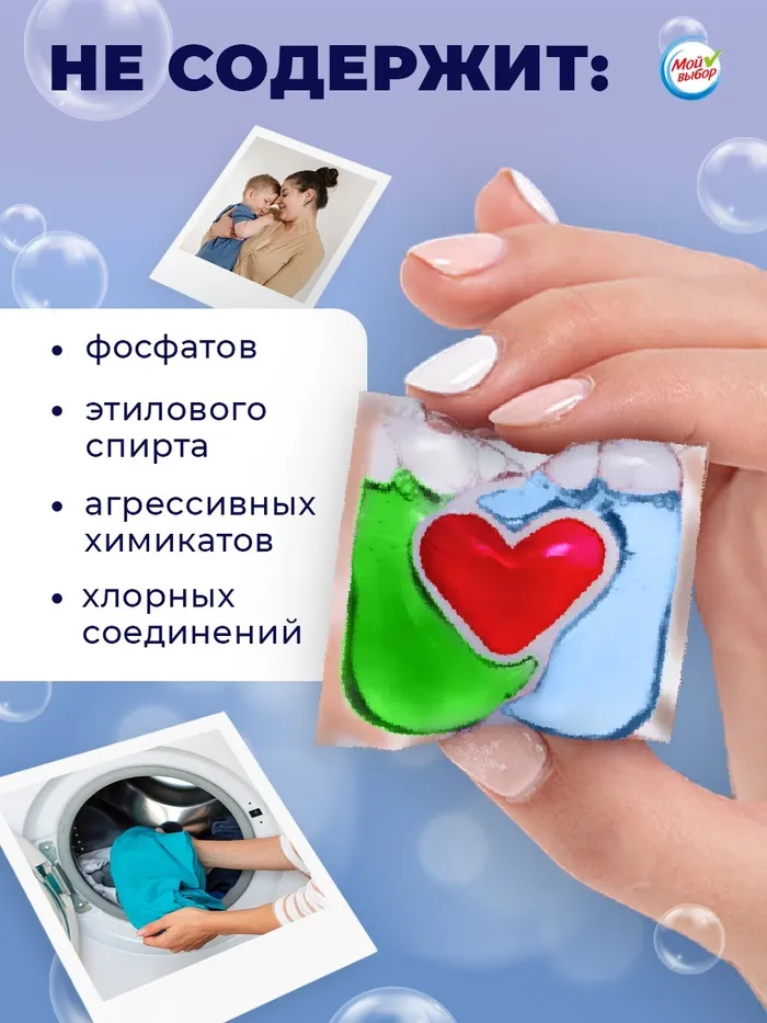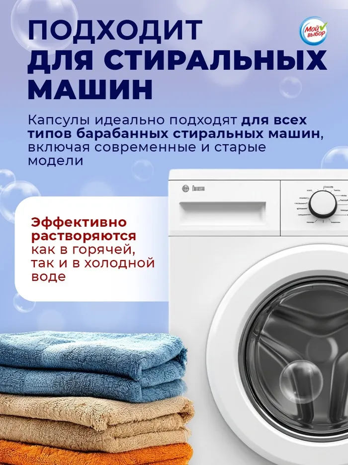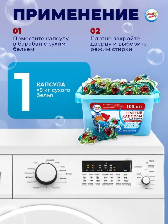 Способ применения: Брать капсулу сухими руками! Не прокалывать, не разрывать, не надрезать! 100% водорастворимая пленка. Капсула помещается непосредственно барабан стиральной машины перед загрузкой белья: 1 капсула используется 4-5 кг сухого белья, для более 5 кг или при сильном загрязнении использовать 2 капсулы. Соблюдать рекомендации для стирки, указанные на бирке одежды (изделия из ткани). Не применять режим замачивания и предварительную стирку. Не рекомендуется использовать для режимов автоматической стирки длительностью менее 40 минут.